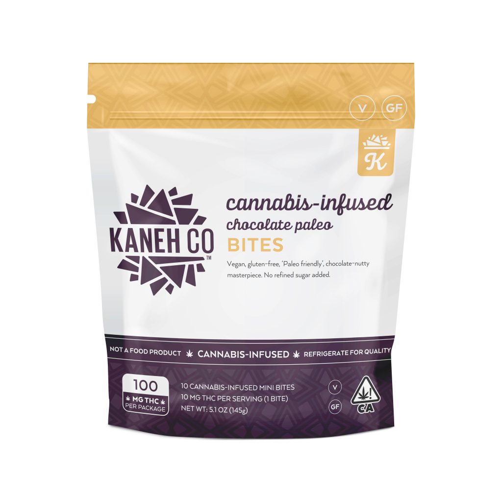 Kaneh Co Bites come in both the chocolate paleo and a superfood granola flavor, which is also vegan and gluten free. Both have 10mg of THC per bite and each bag contains 10 bites, for a total of 100mg THC per package.