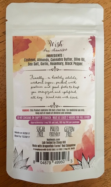 The Sativa edible is called Ember and it promotes functionality and creativity. It’s flavored with caramel, cayenne, toasted cashews and California apricots. If you are sensitive to spicy, don’t be put off because I love spicy and I hardly noticed any heat when I tried it, so it’s a mellow heat offset by the nuts and apricots. It is vegetarian and almost vegan (if your vegan eats honey) with the cannabis infused in coconut oil.