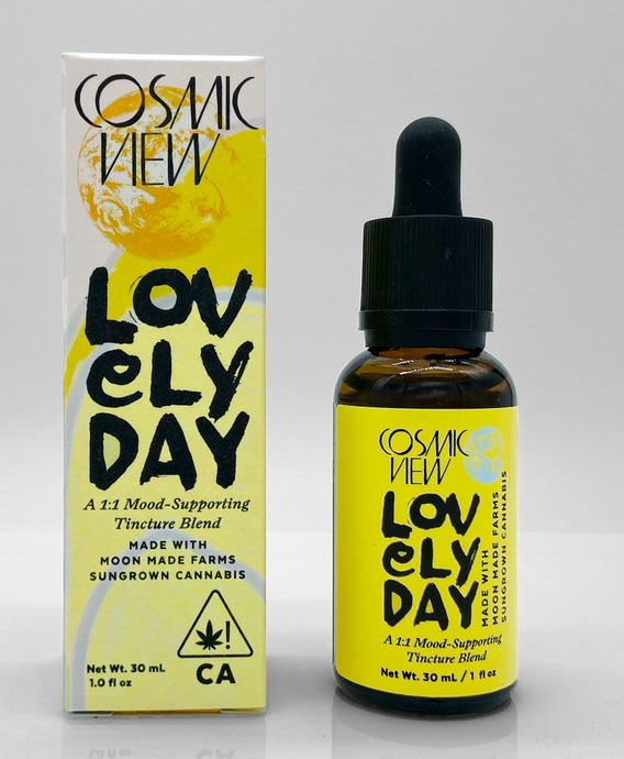 Cosmic View makes a variety of handcrafted botanical cannabis infused tinctures in varying formulas. Their Lovely Day formula provides 7.1mg of CBD and 8.2mg of THC, .6mg CBG, and .4 CBC in each dose. They are labeled with the specific strain used in the formulation, in this case Sapphire-Tsu and Hawaiian Fanta,