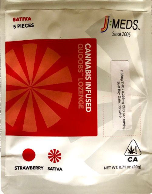JMeds’ “Quoobs” lozenges are cannabis-infused hard candies made in both a Sativa and an Indica formula. They come 5 lozenges to a package, each labeled with the tested potency per serving. The testing sample we used had a total of 36.5mg of THC in the package. These are potent edibles.